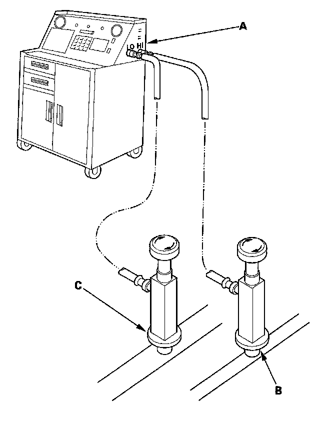 1. Connect an R-134a refrigerant recovery/recycling/charging station (A) to the high-pressure service port (B) and the low-pressure service port (C), as shown, following the equipment manufacturer's instructions.