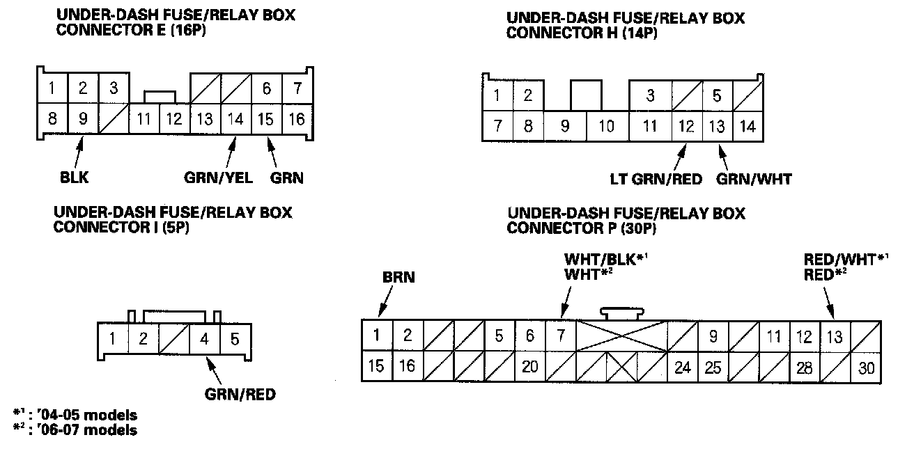 5. Reconnect the connectors to the under-dash fuse/relay box, turn the ignition switch ON (II), and make these input tests at the appropriate connectors on the under-dash fuse/relay box.
