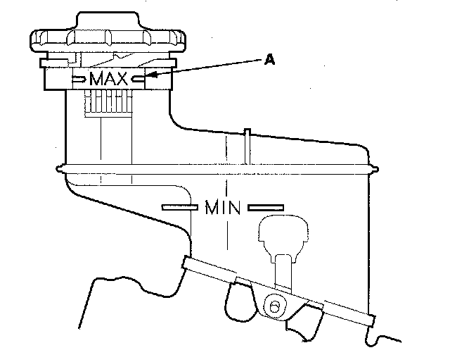 1. Make sure the brake fluid level in the reservoir is at the MAX (upper) level line (A).