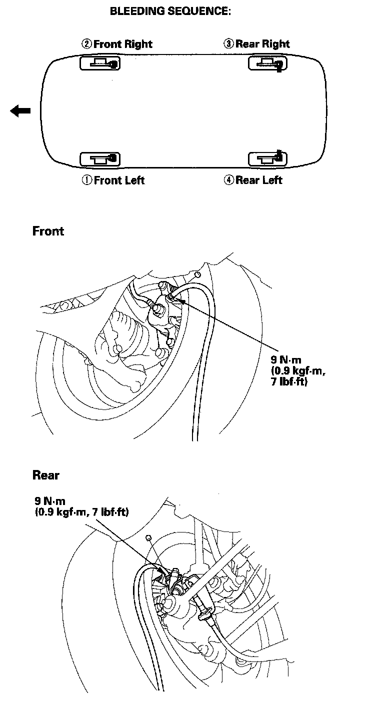 5. Repeat the procedure for each wheel in the sequence shown following until air bubbles no longer appear in the fluid.