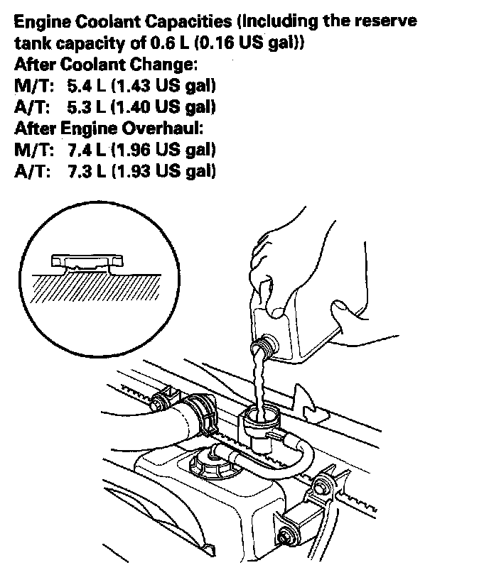 7. Pour Acura Long Life Antifreeze/Coolant Type 2 into the radiator up to the base of the filler neck.