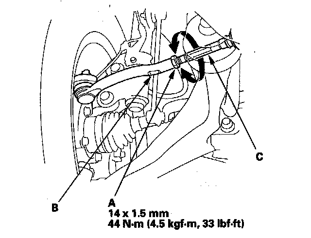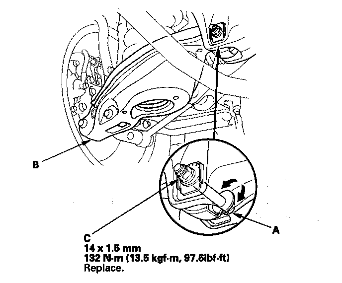 3. Hold the adjusting bolt (A) on the lower arm B, and remove the self-locking nut (C).