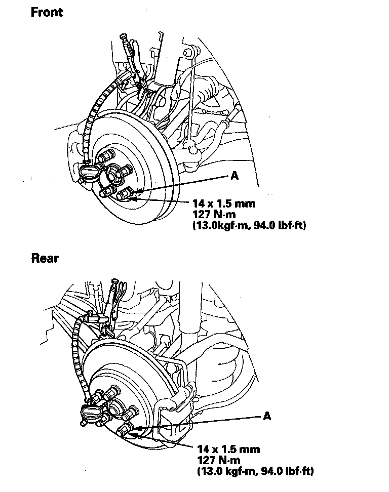 3. Install suitable flat washers (A) and the wheel nuts. Tighten the nuts to the specified torque to hold the brake disc or the brake disc/drum securely against the hub.