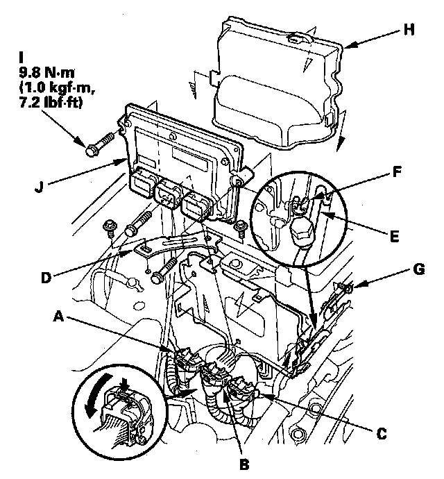 13. Remove the cover (H), then disconnect the PCM connectors A, B, and C.