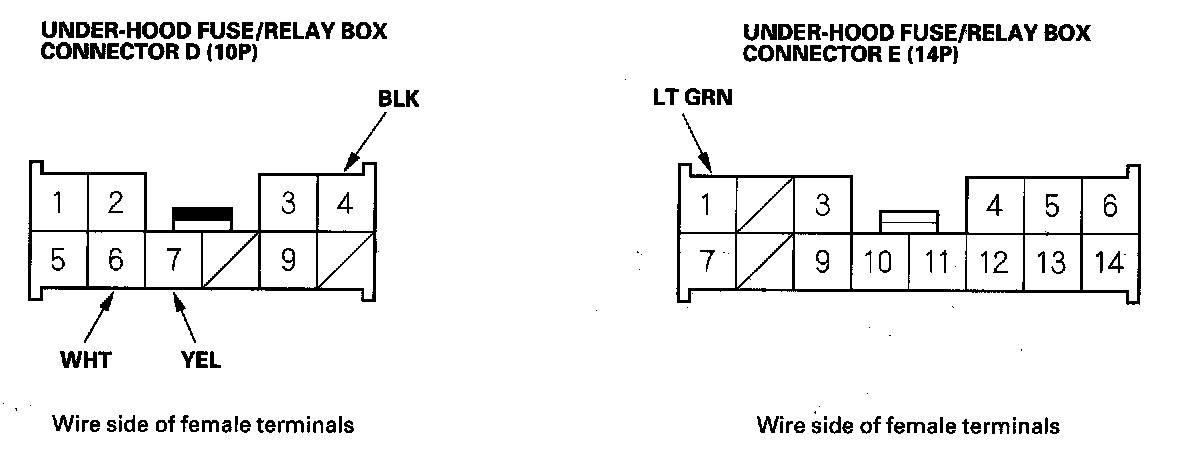 3. Disconnect under-hood fuse/relay box connectors D (10P) and E (14P).