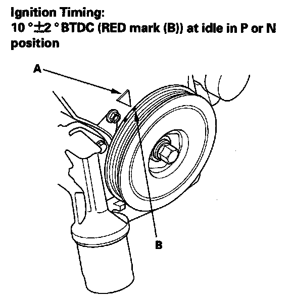 9. Aim the light toward the pointer (A) on the timing belt cover. Check the ignition timing under a no load condition (headlights, blower fan, rear window defogger, and air conditioner are turned off).