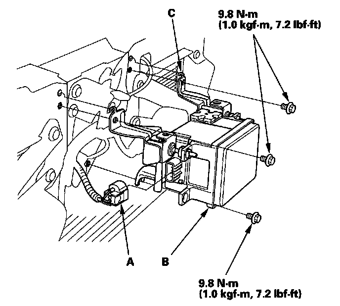 4. Loosen the aiming bolts (A) a little at a time, and remove the millimeter wave radar unit (B) from the main bracket (C).