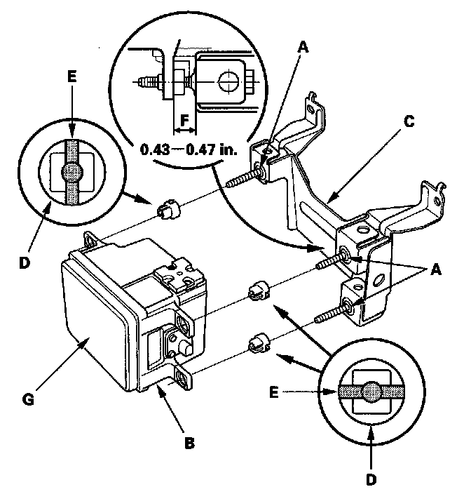 6. Tighten the main bracket bolts a little at a time until the clearance between the millimeter wave radar unit and the main bracket is 0.43 - 0.47 in. (11 - 12 mm) (F). Make sure the millimeter wave radar unit is parallel with the main bracket.