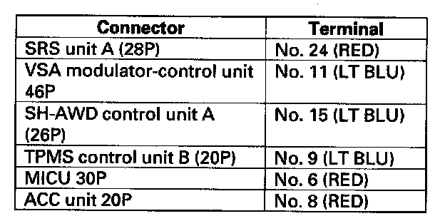 NO - Repair short in the wire between the DLC (K-line) and the VSA modulator-control unit, the SH-AWD control unit, the TPMS control unit, or the ACC unit.