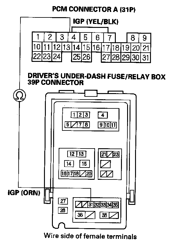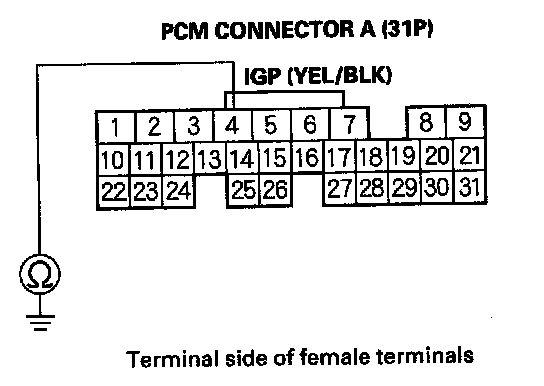 61. Check for continuity between PCM connector terminal A4 and driver's under-dash fuse/relay box 39P connector terminal No. 31.