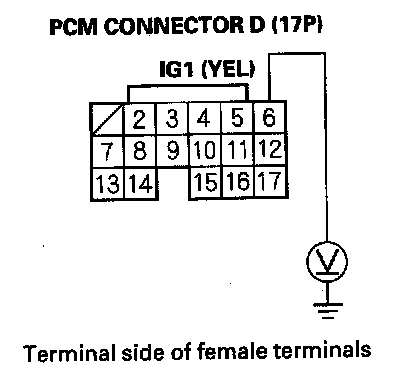 54. Measure voltage between PCM connector terminal D6 and body ground.