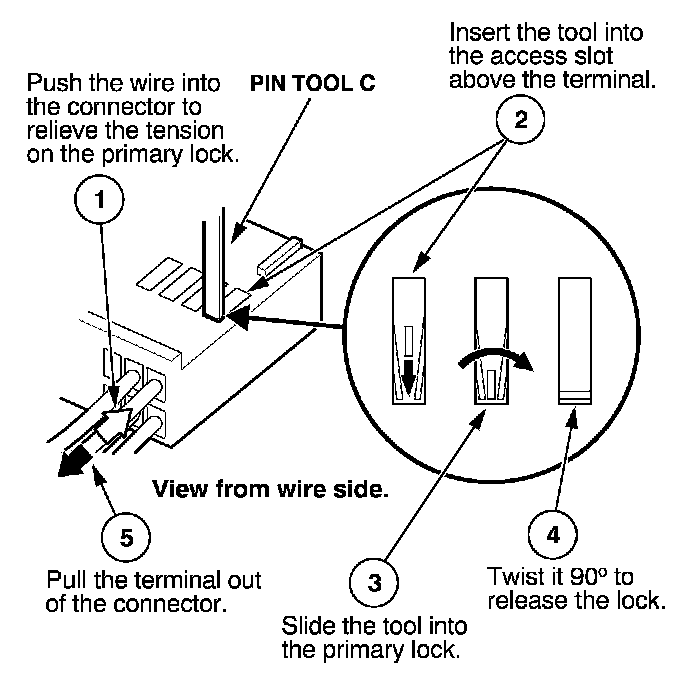 Before you begin, inspect the wire you are about to repair for damage and length. Make sure the wire will be long enough to make a terminal repair without stretching it when you reinstall the terminal in the connector. If the wire is too short, or if access to the connector is too restricted to make a terminal repair, you may need to install a pigtail terminal (a short length of wire with a factory-crimped terminal on it). Refer to HOW TO INSTALL PIGTAIL TERMINALS.