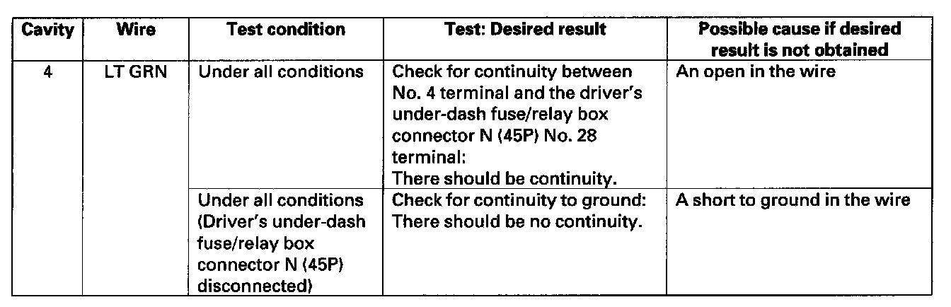 4. Reconnect the connector to the wiper/washer switch, and make these input tests at the connector.