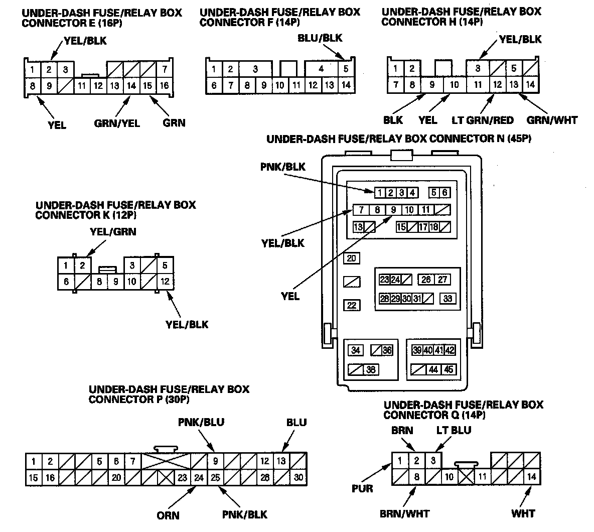 3. Disconnect under-dash fuse/relay box connectors E, F, H, K, N, P, and Q.