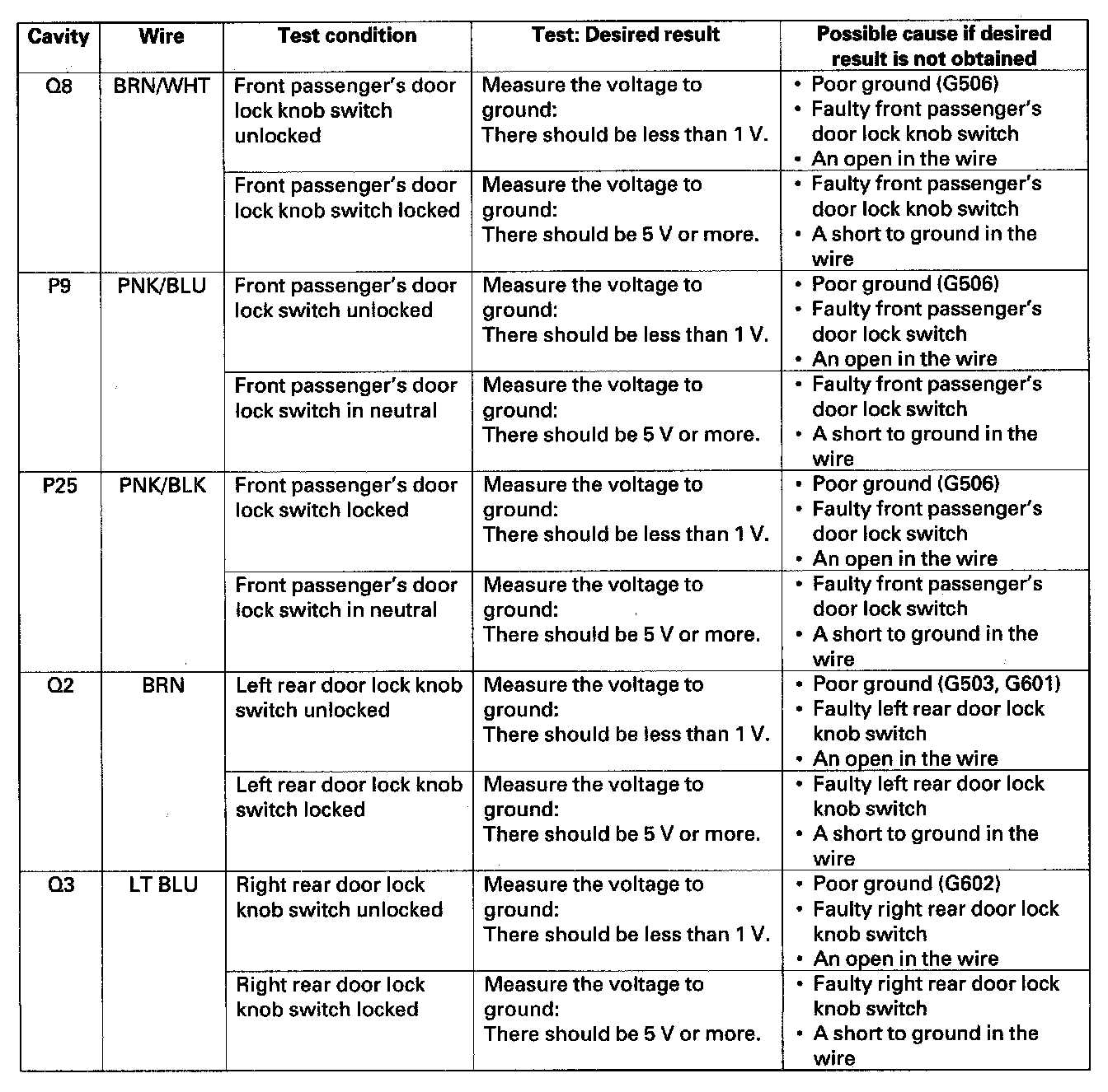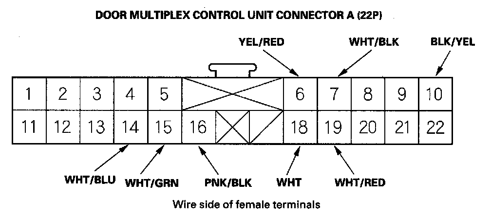 12. Reconnect the connector to the door multiplex control unit. Turn the ignition switch ON (II) and make these input tests at the connectors.