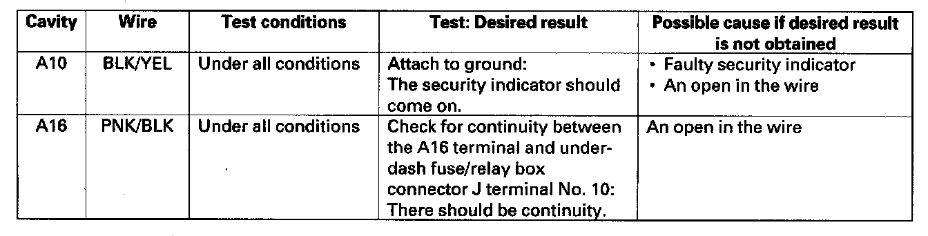 6. Reconnect all connectors to the under-dash fuse/relay box. Turn the ignition switch ON (II), and make these input tests at the appropriate connectors on the under-dash fuse/relay box.