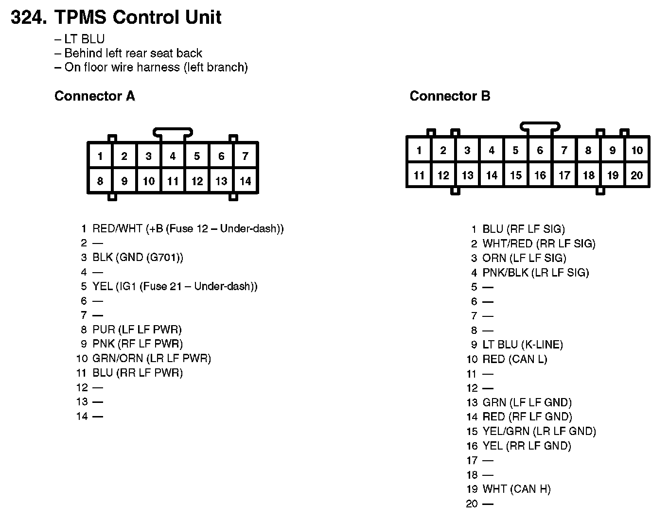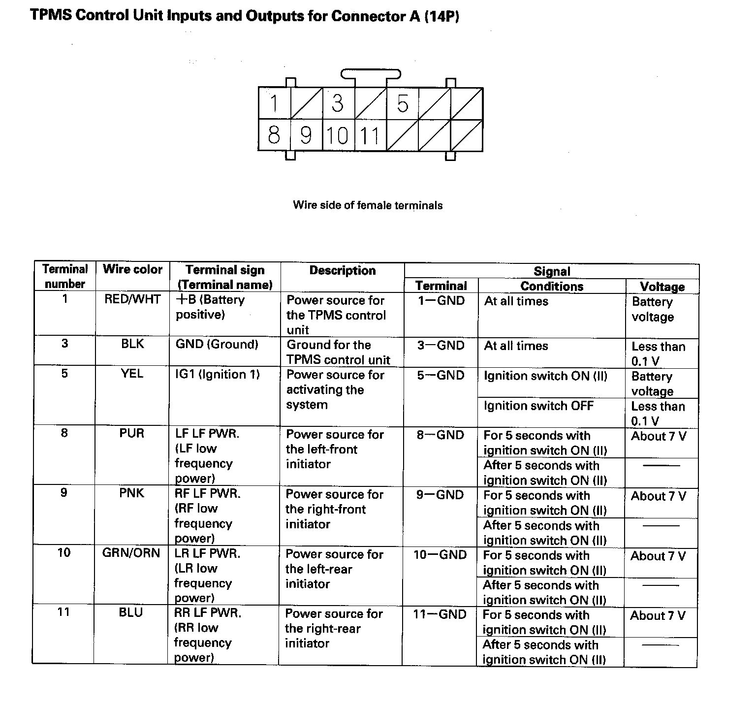 TPMS Control Unit Inputs and Outputs for Connector A (14P):