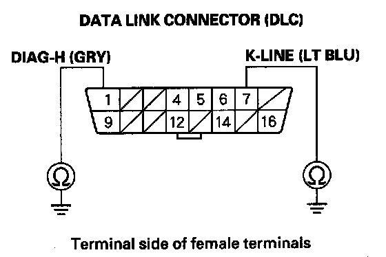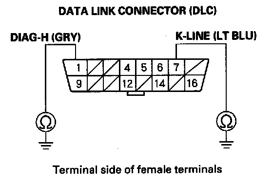 16. Check for continuity between body ground and DLC terminals No. 1 and No. 7 individually.