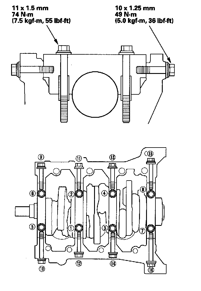 Tighten the bearing cap bolts, and then the bearing cap side bolts to the specified torque in the sequence shown. Repeat the torque sequence again to make sure the bolts are properly torqued.