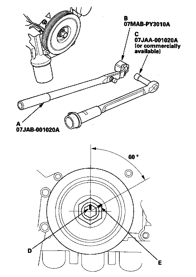 2) Mark the bolt head (D) and crankshaft pulley (E) as shown, then tighten the bolt an additional 60° (The mark on the bolt head lines up with the mark on the crankshaft pulley).