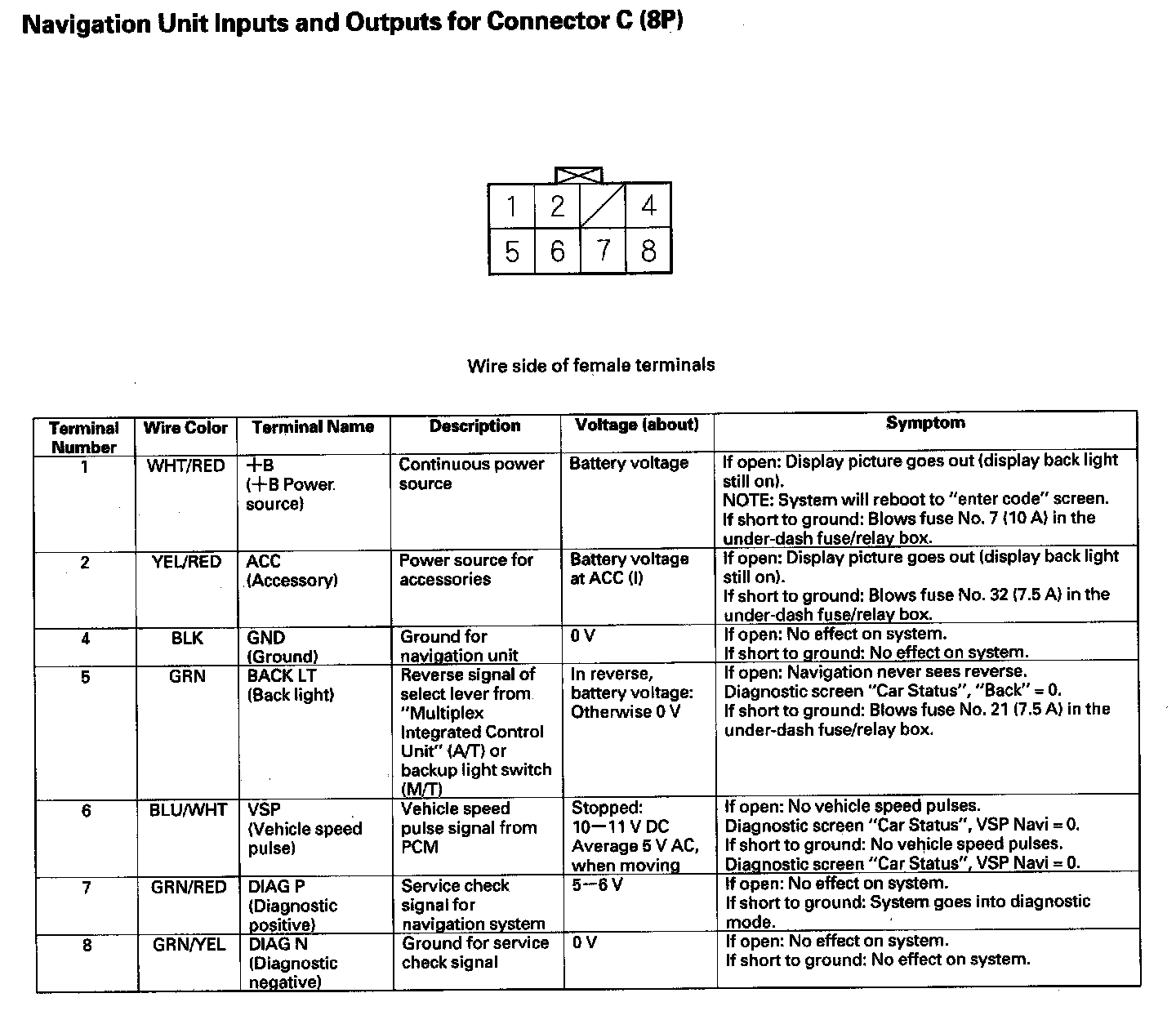 Navigation Unit Inputs And Outputs For Connector C (8P):