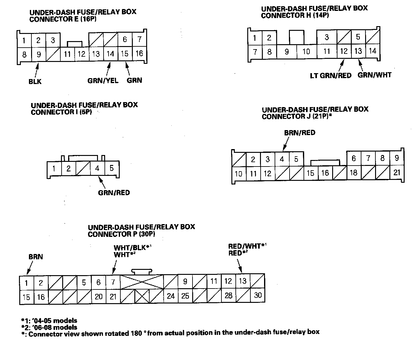 6. Disconnect the under-dash fuse/relay box connectors J (21P), P (3OP) and W (5P), and make these input tests at the connector.
