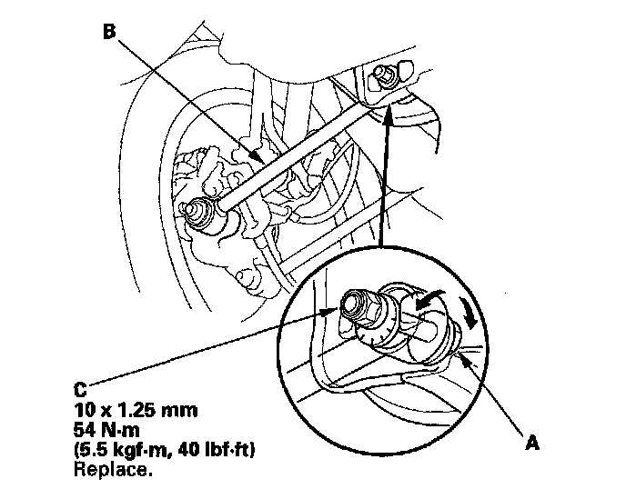 3. Hold the adjusting bolt (A) on the rear control arm (B), and loosen the self-locking nut (C).