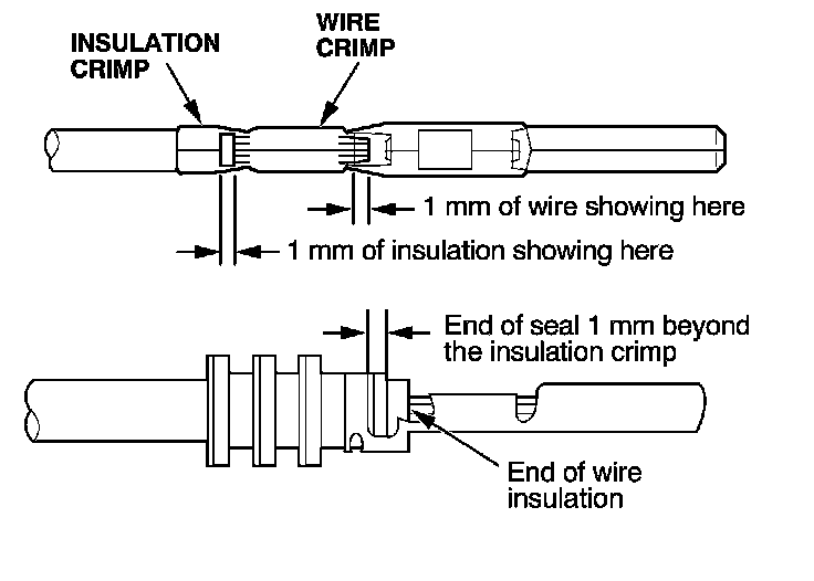 3. Strip the insulation off the end of the wire so the wire fits in the new terminal as shown. (If the wire has a wire seal, replace it with a new one from the kit.)