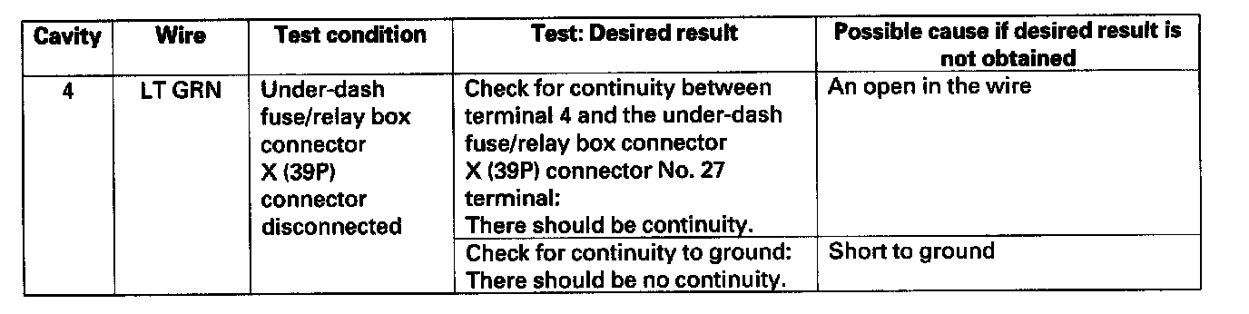 4. Reconnect the connector to the wiper/washer switch, turn the ignition switch ON (II), and make these input tests at the connector.