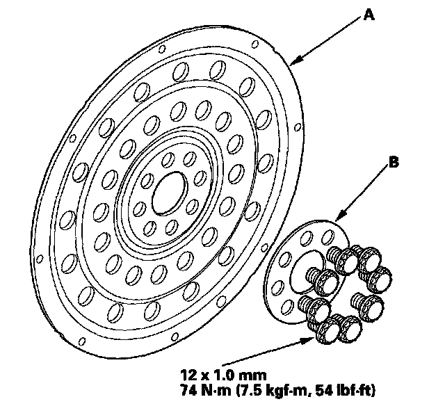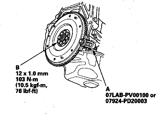 Torque the flywheel mounting bolts (B) in a crisscross pattern in several steps.