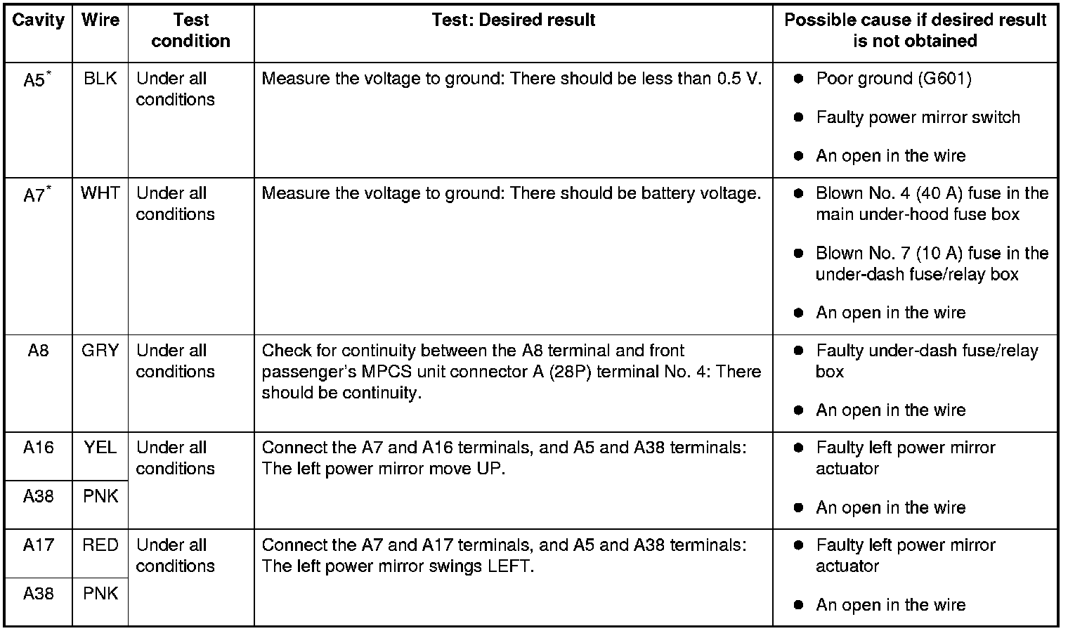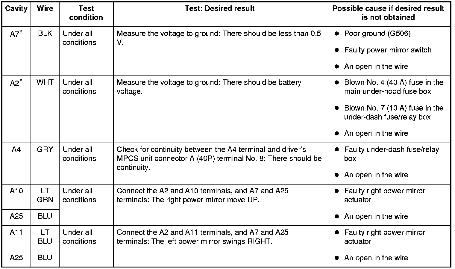 NOTE: Before testing the power mirror circuit unit, troubleshoot the multiplex integrated control unit first, using B-CAN System Diagnosis Test Mode A. Troubleshooting - B-CAN System Diagnosis Test Mode A