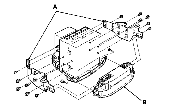 2. Remove the self-tapping screws, bolts, brackets (A), and the climate control unit (B).