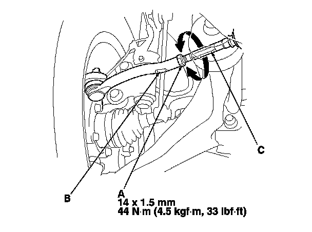 3. Loosen the tie-rod locknuts (A) while holding the flat surface sections (B) of the tie-rod end with a wrench, and turn both tie-rods (C) until the front toe is within specifications.