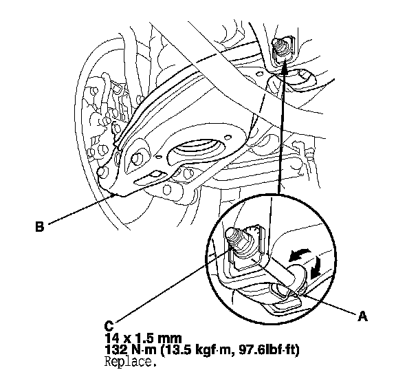 3. Hold the adjusting bolt (A) on the lower arm B, and remove the self-locking nut (C).