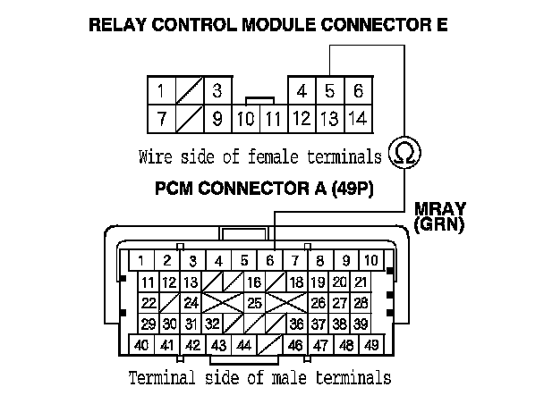 NO - Repair open in the wire between the relay control module connector E terminal No. 5 and the PCM (A6).
