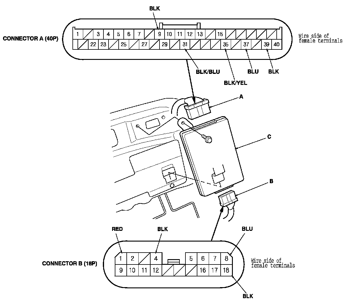 3. Disconnect the 40P connector (A) and 18P connector (B) from the power seat control unit (C).