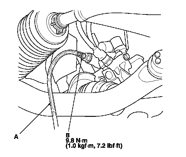 4. Install a rubber hose (A) on the drain bolt (B) located at the rear of the cylinder block, then loosen the drain bolt.