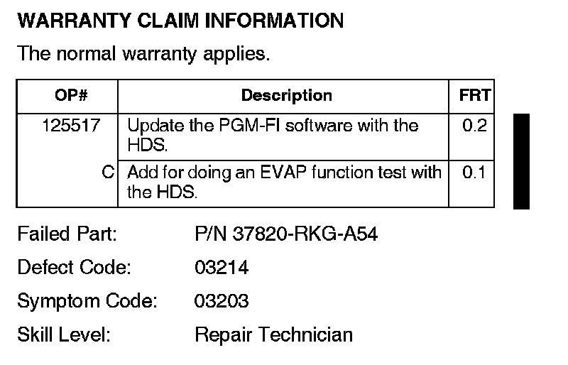 Update the PGM-FI software with the HDS, then check the EVAP system by doing an EVAP function test with the HDS.