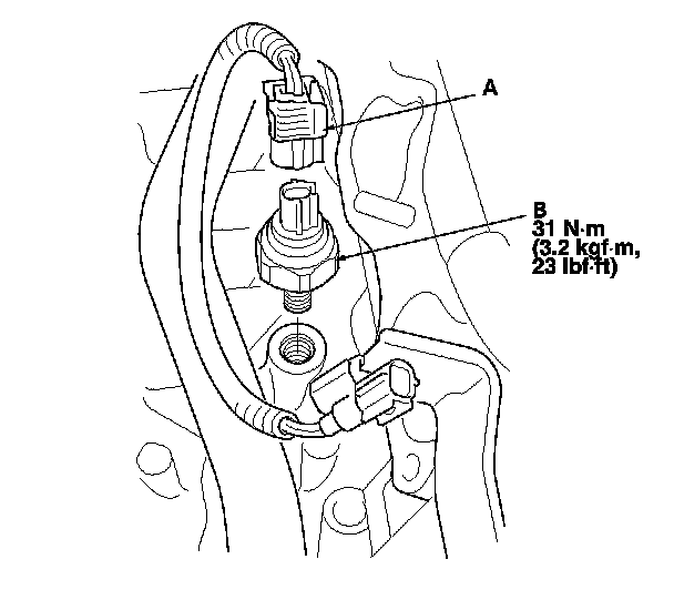 3. Disconnect the knock sensor connector (A), then remove the knock sensor (B).