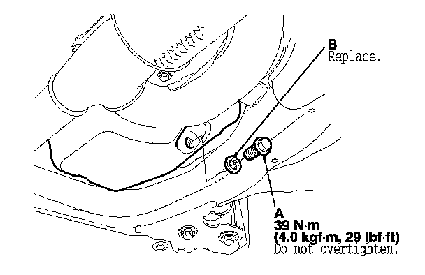 3. Reinstall the drain bolt with a new washer (B).