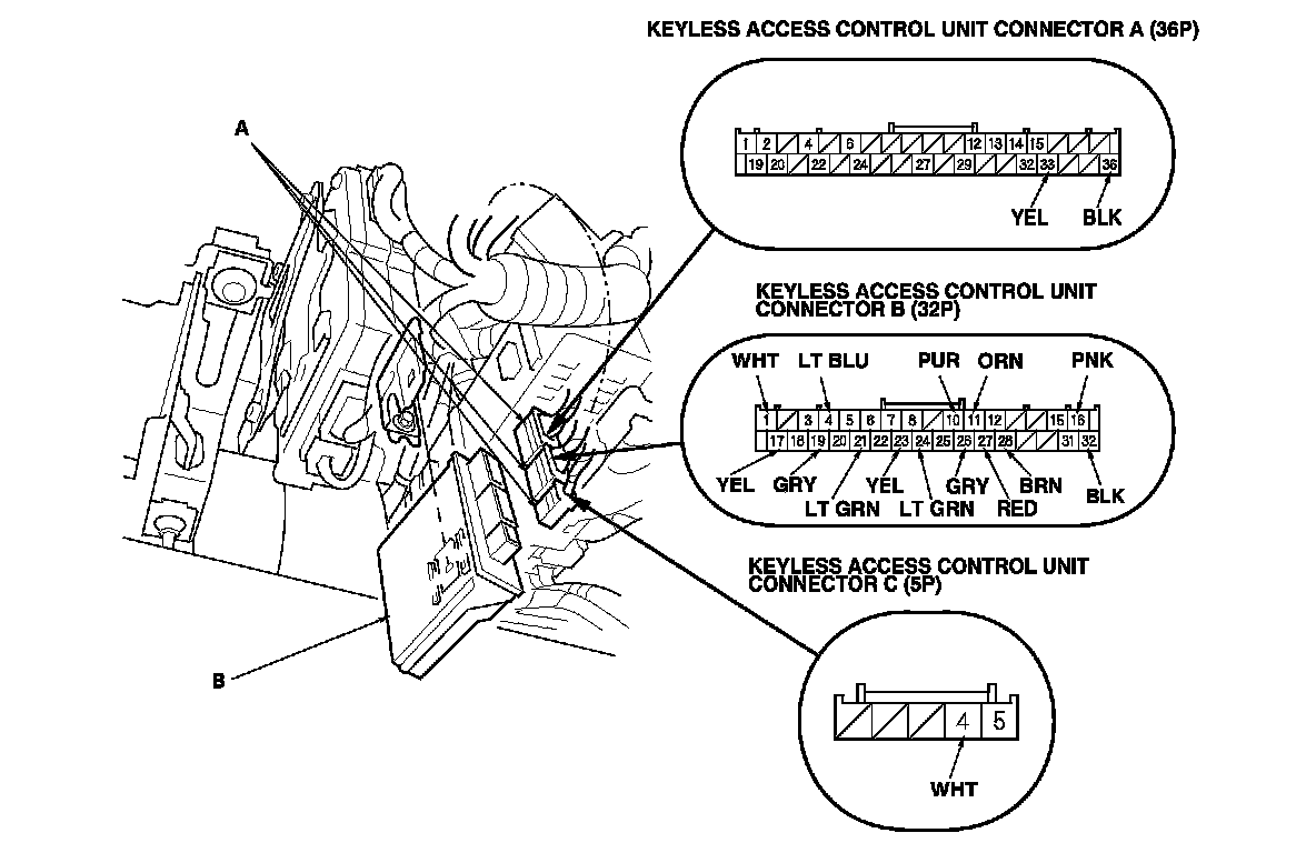 3. Disconnect the connectors (A) from the keyless access control unit (B).