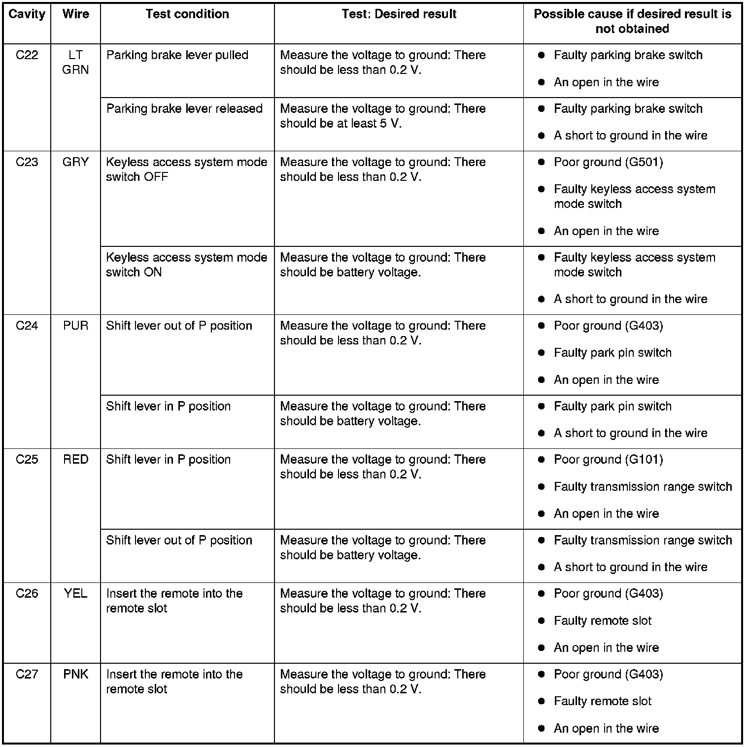 24. If multiple failures are found on more than one control unit, replace the keyless access control unit. If input failures are related to a particular control unit, replace the control unit.
