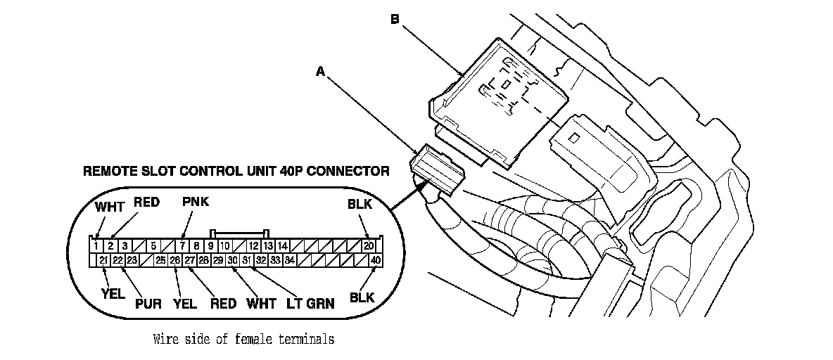 20. Disconnect the connector (A) from the remote slot control unit (B).
