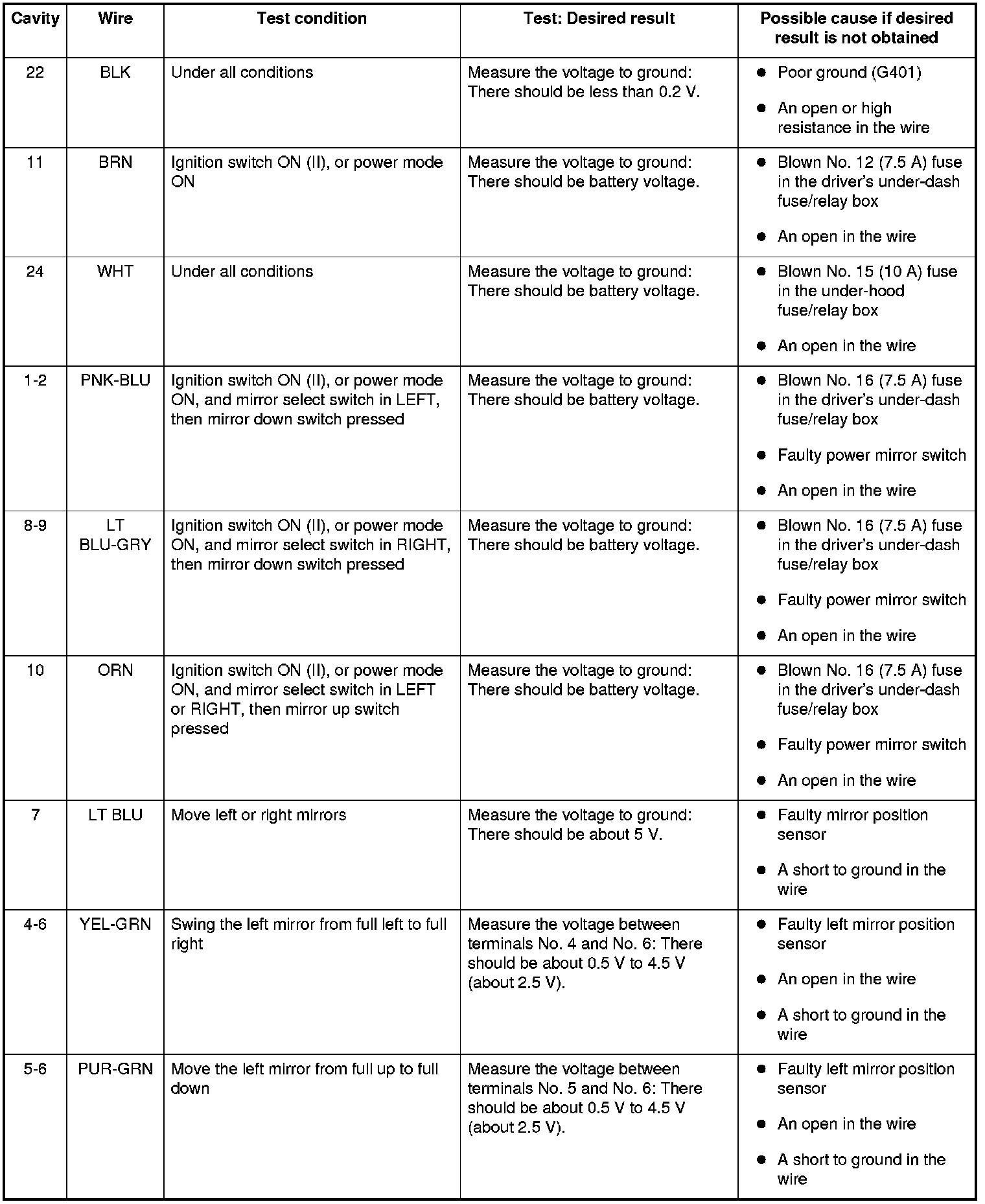 6. Turn the ignition switch to LOCK (0), or press the engine start/stop button to select the OFF mode, then disconnect the connectors from the power mirror control unit, and do these input tests at the following connectors.