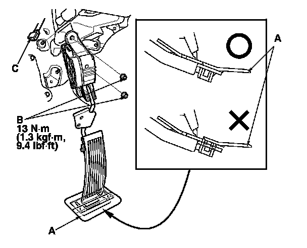 3. Install the nuts (B), and connect the APP sensor 6P connector (C).
