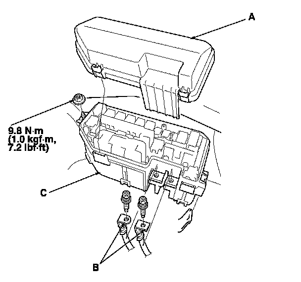 3. Remove the under-hood fuse/relay box (C) from the bracket.