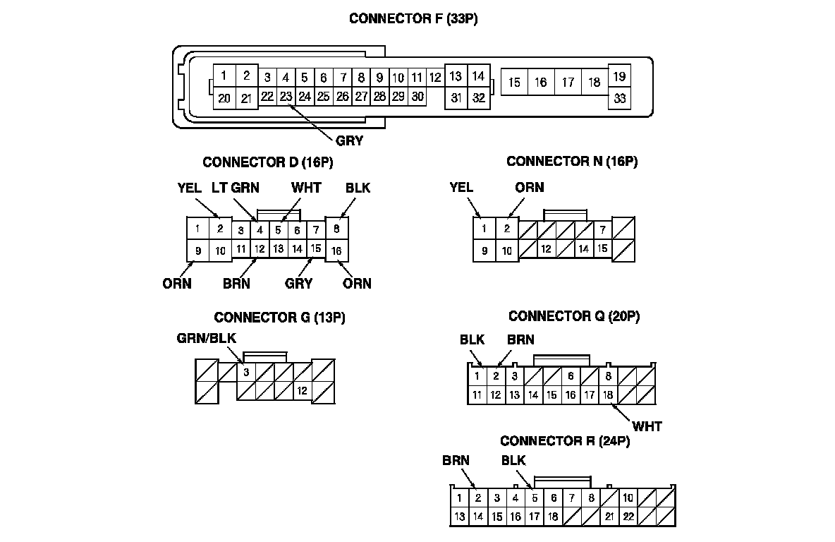 3. Disconnect driver's under-dash fuse/relay box connectors D, F, G, N, Q, and R.