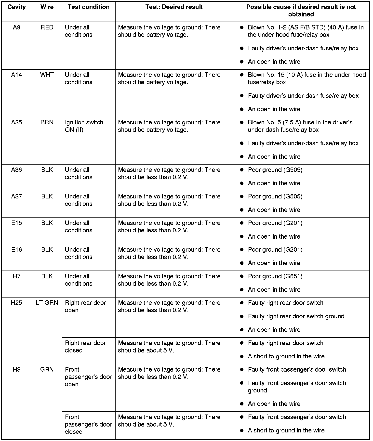 6. Reconnect the connectors to the driver's under-dash fuse/relay box, and do these input tests at the following connectors.