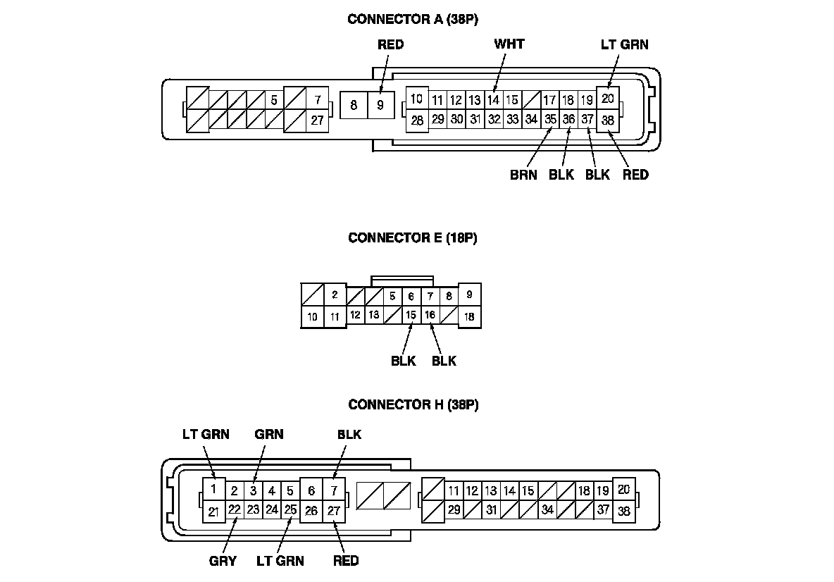 8. Disconnect passenger's under-dash fuse/relay box connectors A, E, and H.