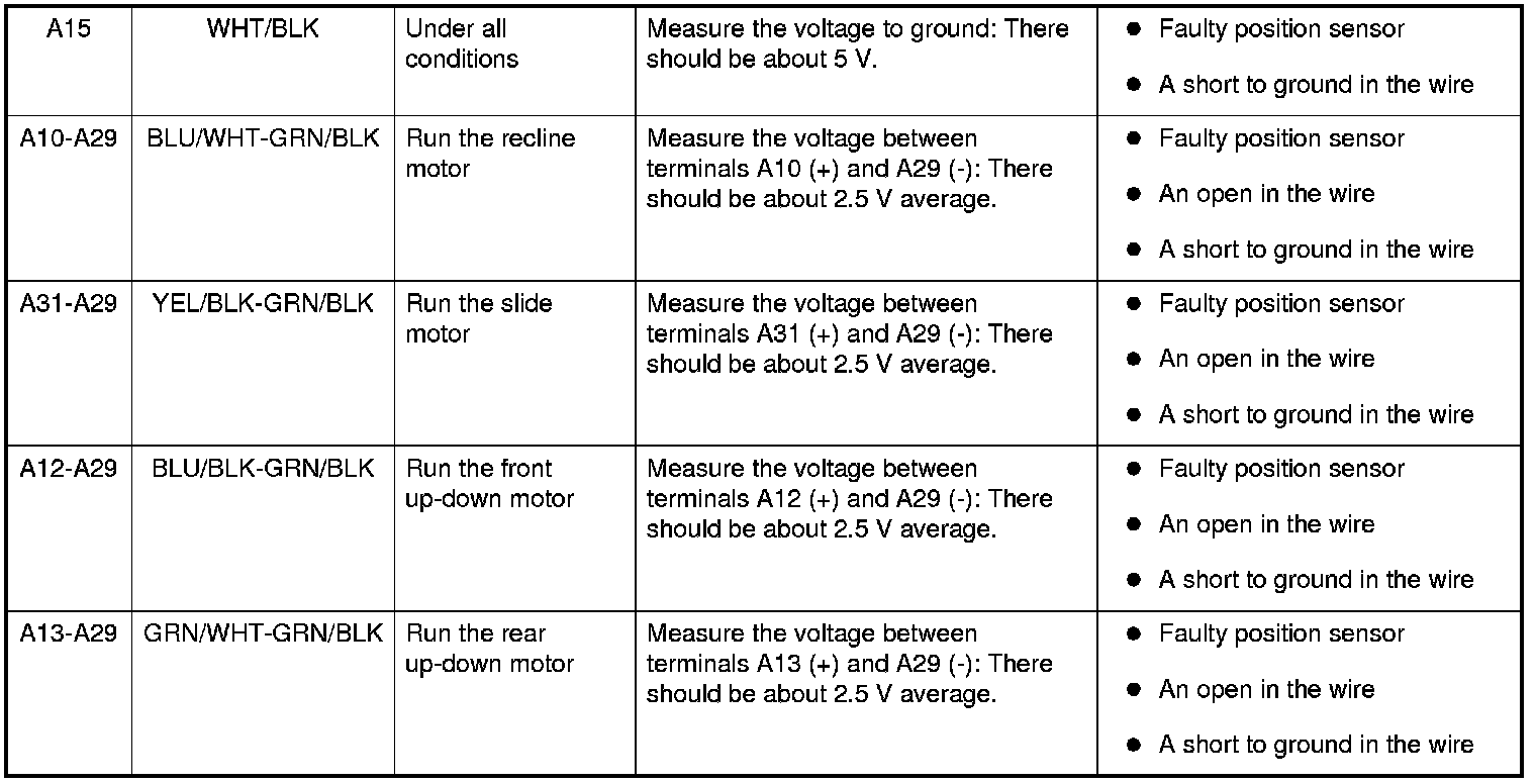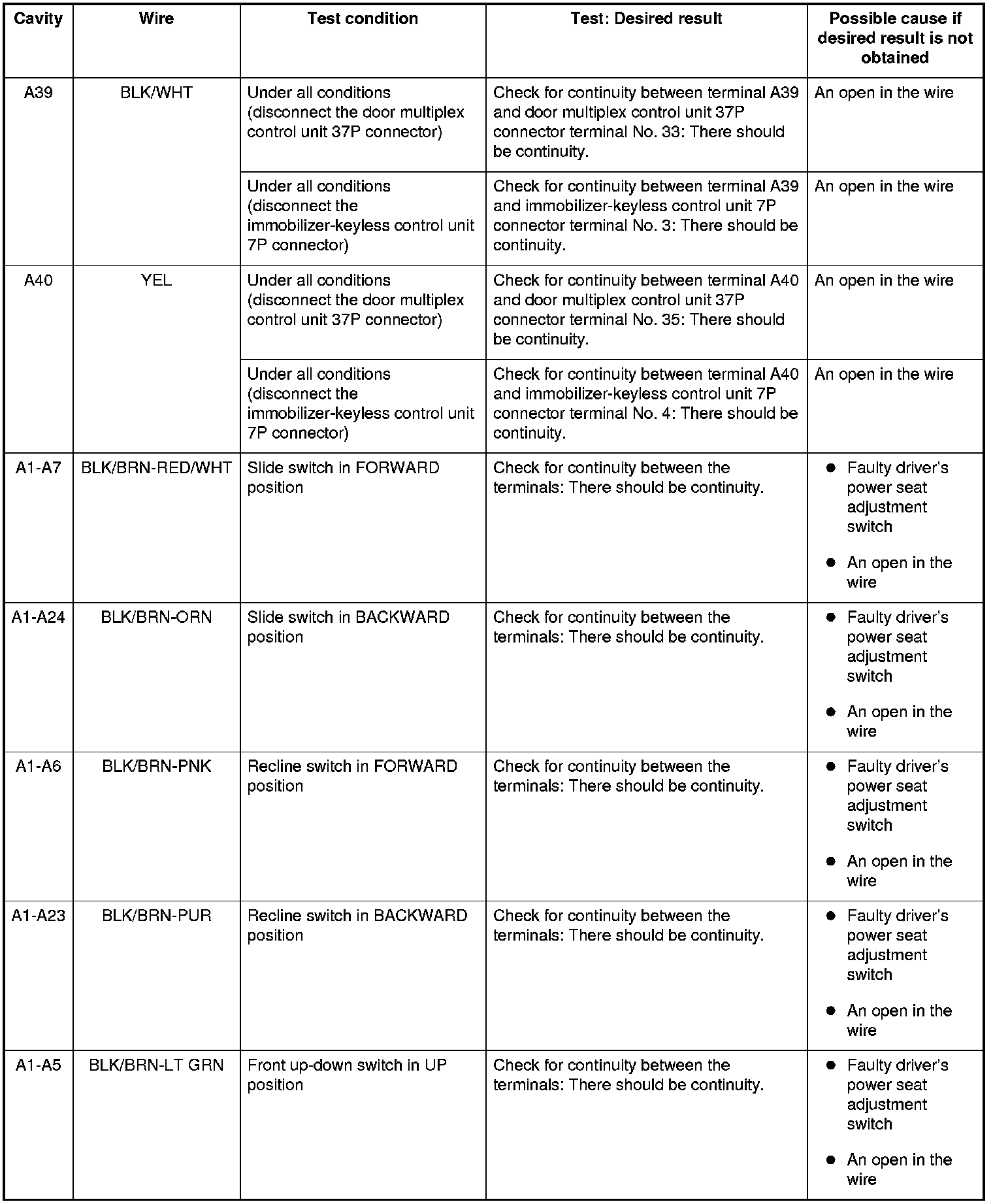 5. Reconnect the connectors to the power seat control unit, and do these input tests at the following connectors.
